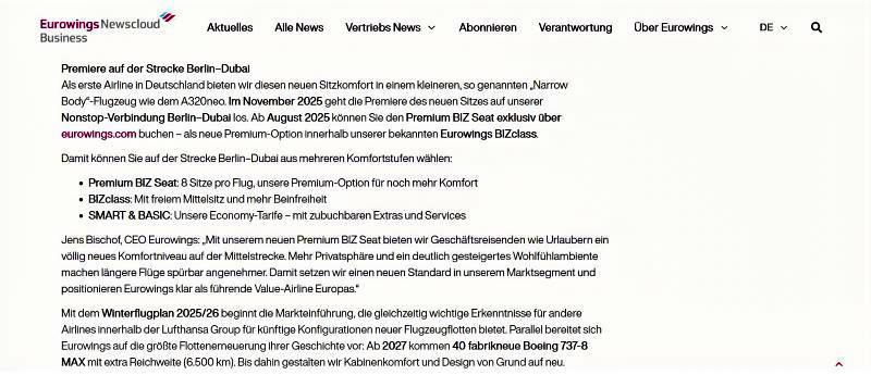 Eurowings: Neue Business Class auf der Mittelstrecke