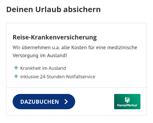 Genau wie in diesem Beitrag habe ich eine Benachrichtigung erhalten, dass ich nun kostenlos die Versicherung von HanseMerkur aktivieren könne. Klicke ich auf den Link und klicke auf Reiseversicherung dazu buchen, kann ich nur kostenpflichtig eine Versicherung bestellen. Die Reise ist in weniger als 7 Tagen.