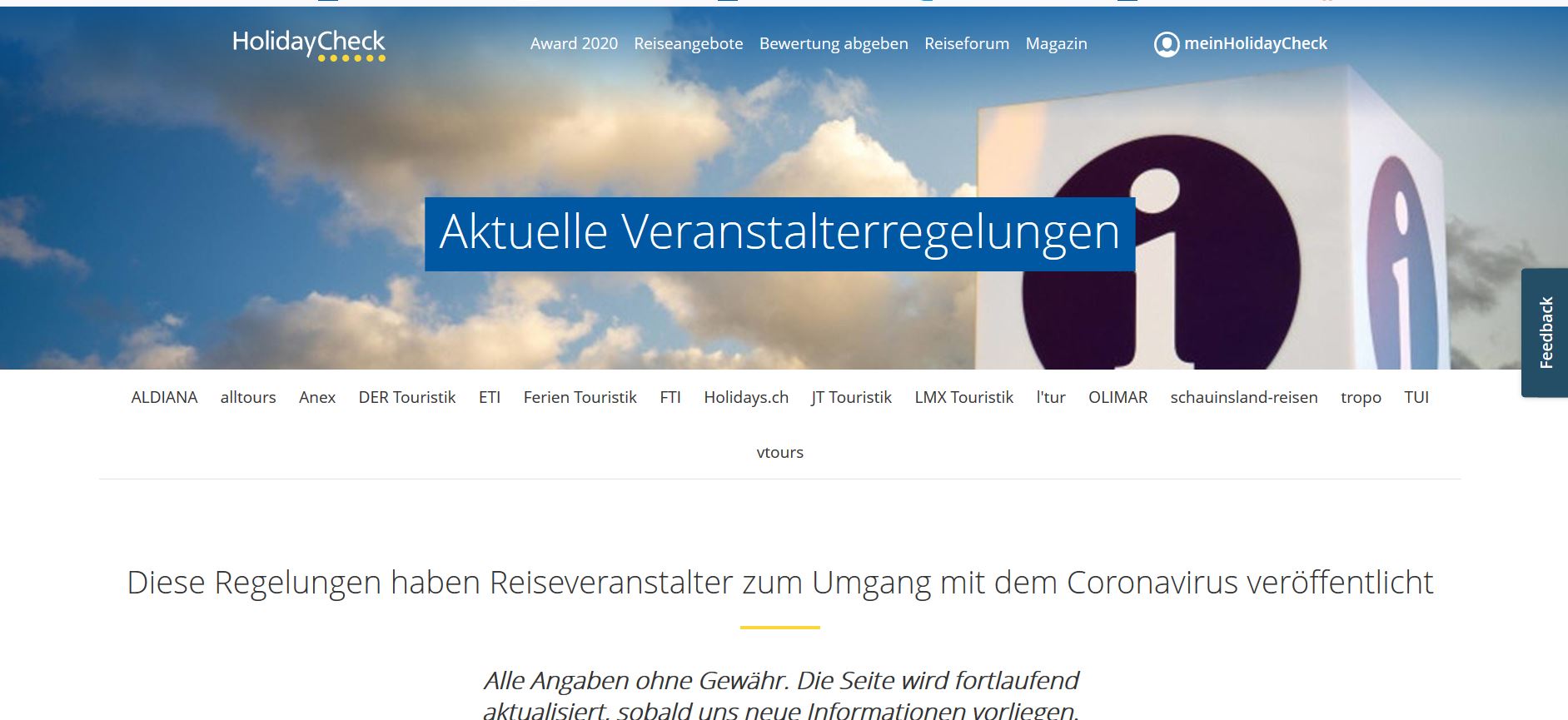 Zur Erinnerung -- diese HolidayCheck Seite- siehe Screenshot unten -- wird immer dann aktualisiert, wenn uns neue Regelungen von einzelnen RV erreichen.