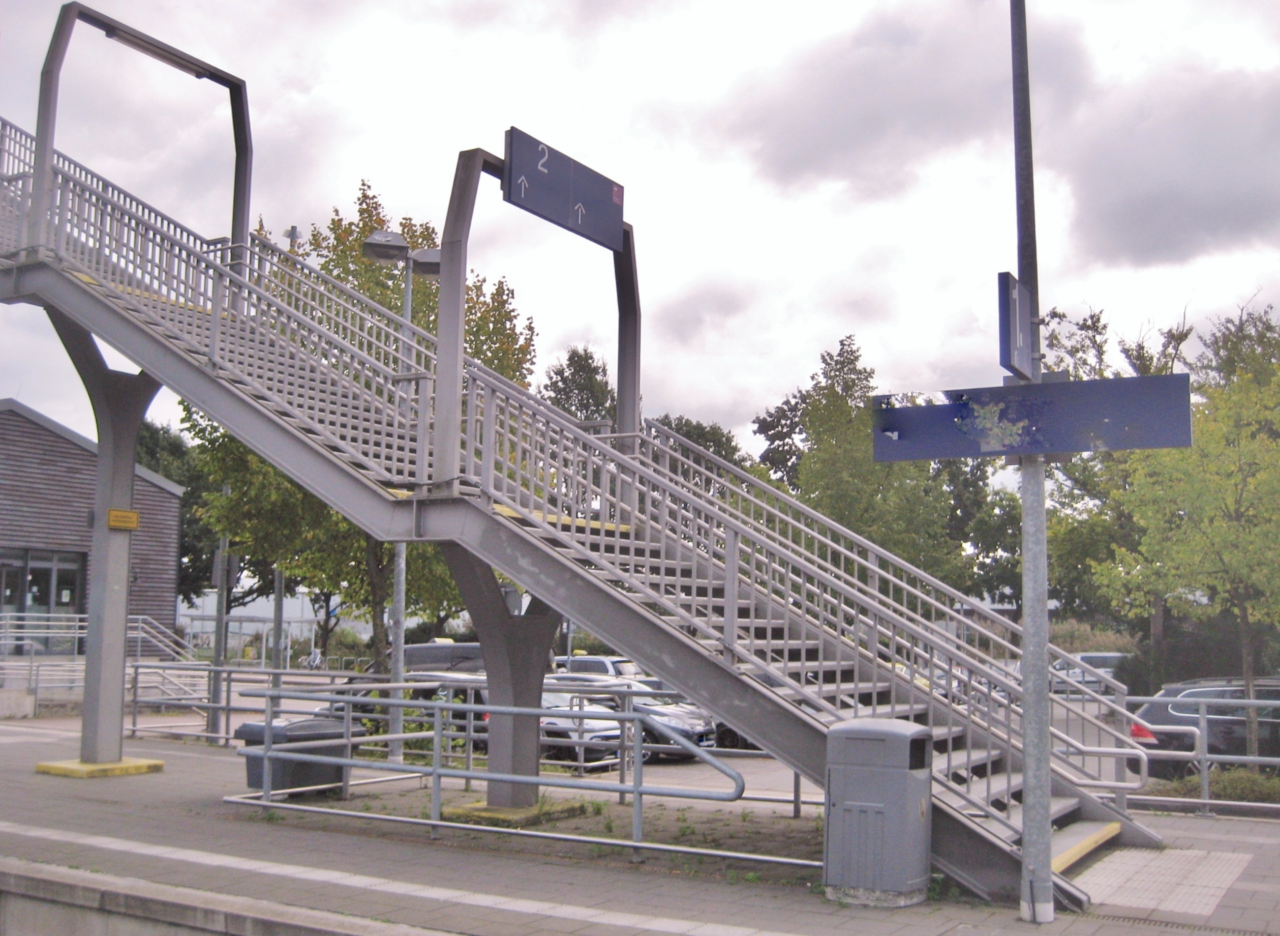 In welcher Stadt gibt es auf dem Bahnhof diese schöne Treppe zum Gleiswechsel mit daneben einem defekten Aufzug ?
