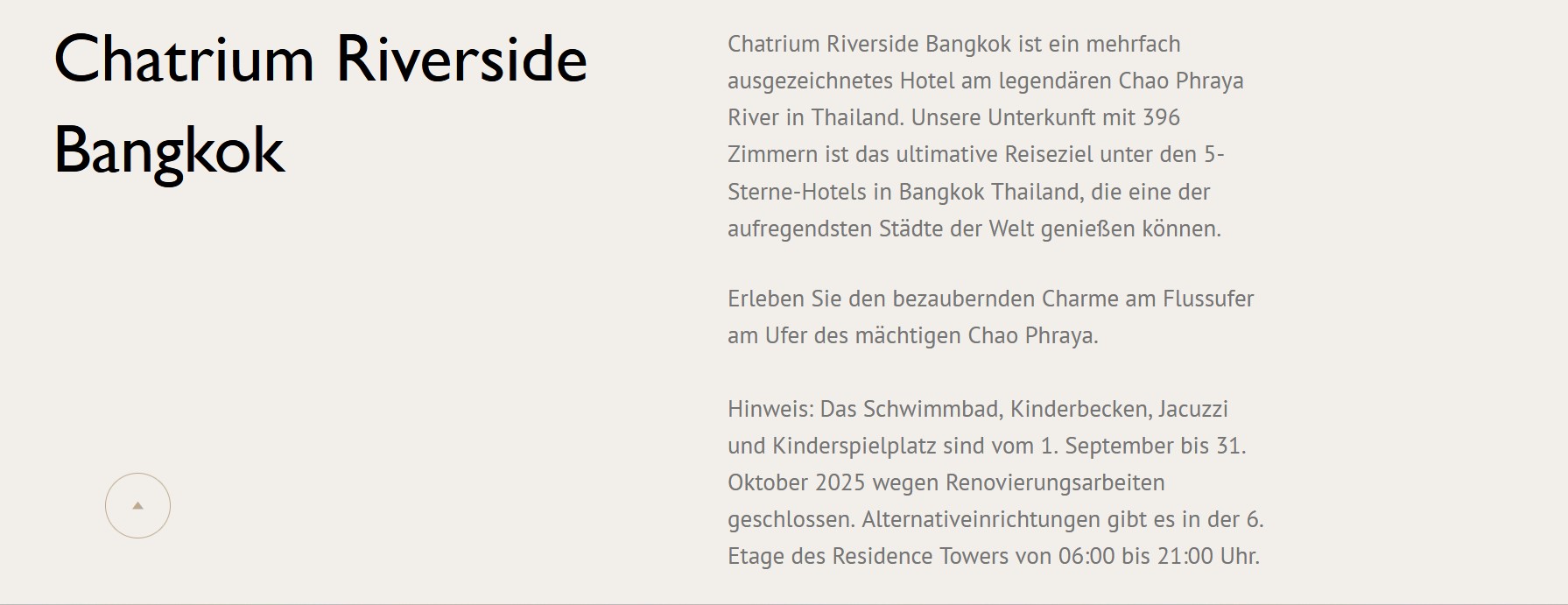 Ich habe bei Dertour das Hotel Chatrium Riverside in Bangkok gebucht und habe nun die Nachricht erhalten, dass der Pool und Whirlpool des Hotels während unseres Aufenthalts wegen Renovierungsarbeiten geschlossen sein wird. Stattdessen ist die Benutzung eines anderen Pools und Whirlpools im Residential Tower möglich über den mir sonst keine weiteren Infos gegeben wurden.