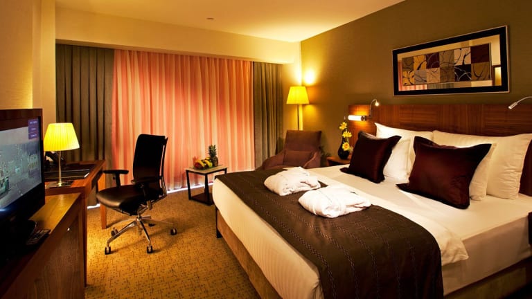 Die Zimmer sind modern gestaltet und verfügen über Klimaanlage, individuell steuerbare Heizung, Teppichboden, Doppelbett oder Kingsize-Bett. Zustellbetten sind auf Anfrage erhältlich. Zur Ausstattung gehören ein Safe, eine Minibar, ein Schreibtisch, ein Minikühlschrank und eine Tee-/Kaffeemaschine sowie ein Bügelset und eine Hosenpresse. Zudem gibt es ein Telefon mit Direktwahl, einen TV mit Satelliten-/Kabelempfang und kostenfreies WLAN. À la carte Toilettenartikel sind im Badezimmer vorhanden, das mit Dusche und Badewanne ausgestattet ist. Zur Verfügung stehen auch barrierefreie Zimmer.