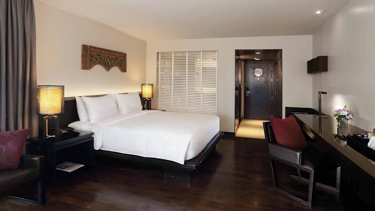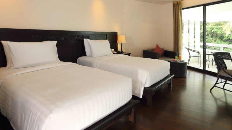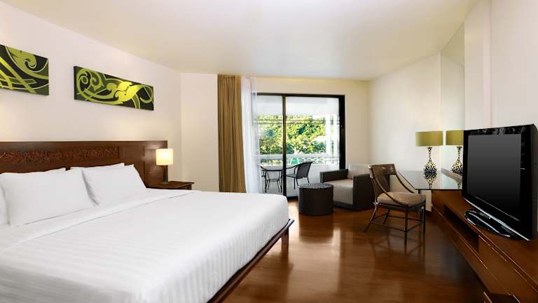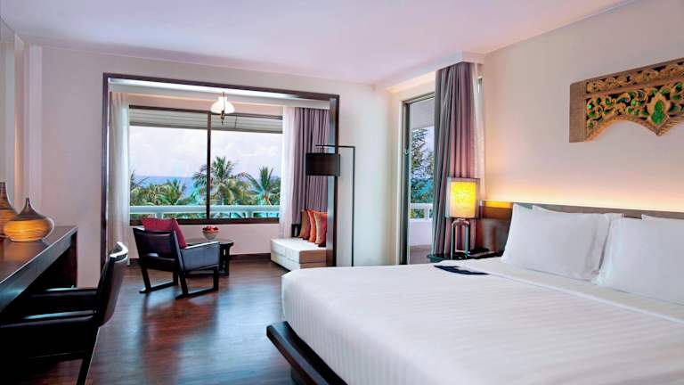 Die Zimmer im Le Meridien Phuket Beach Resort sind geräumig, modern und im thailändischen Stil eingerichtet. Sie verfügen über einen 37-Zoll-Flachbild-TV, einen eigenen Balkon und Holzböden. Zur Ausstattung gehören auch Tee- und Kaffeezubereitungsmöglichkeiten, kostenfreier WLAN-Zugang und Bademäntel. Die Zimmer sind komfortabel und bieten eine angenehme Atmosphäre für einen erholsamen Aufenthalt.