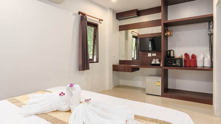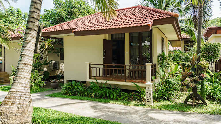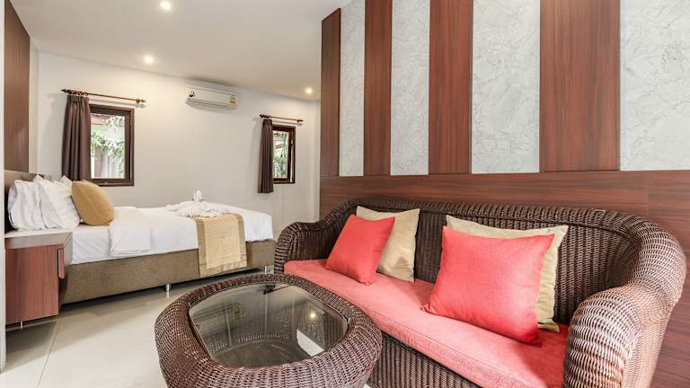 Die modern gestalteten Bungalows im Promtsuk Buri bieten Ihnen einen komfortablen Rückzugsort. Jeder Bungalow verfügt über einen eigenen Balkon, auf dem Sie die tropische Umgebung genießen können. Die Zimmer sind geräumig und mit Hartholzmöbeln ausgestattet. Zur Ausstattung gehören auch ein Sitzbereich, Kabel-TV und kostenfreies WLAN.