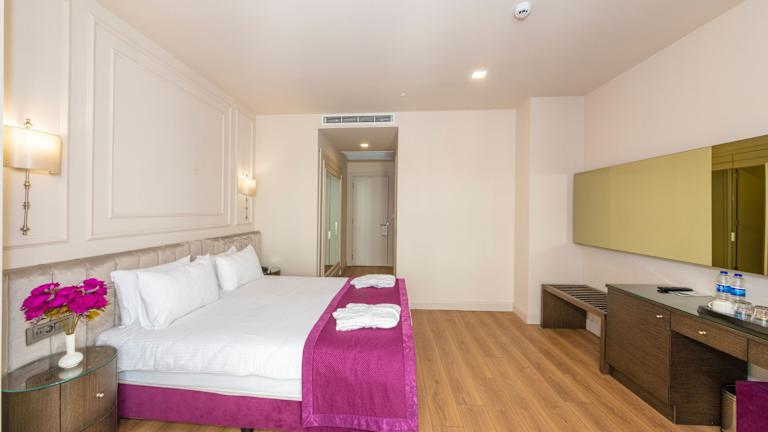Die Zimmer im Hotel Beyaz Saray - Special Category sind modern und komfortabel eingerichtet. Sie verfügen über raumhohe Fenster, die viel Tageslicht hereinlassen und eine elegante Atmosphäre schaffen. Zur Ausstattung gehören kostenfreies WLAN, ein Plasma-Sat-TV, ein Safe und eine Minibar. Die Klimaanlage kann zentral gesteuert werden und sorgt für angenehme Temperaturen.