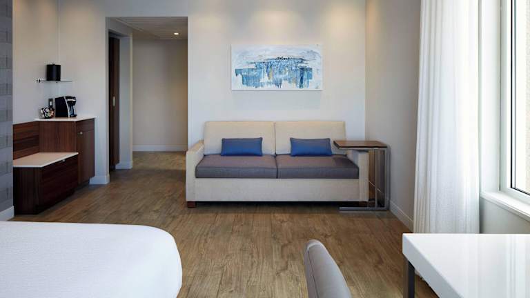 Die 159 Nichtraucherzimmer des Hotels erstrecken sich über 12 Etagen und sind bequem mit dem Aufzug erreichbar. Die Zimmer sind mit Teppichboden, einem 55-Zoll-TV, einer Kaffeemaschine von Kurig, einem Bügeleisen/-brett und einem Haartrockner ausgestattet. Einige Zimmer bieten zudem einen herrlichen Blick auf die Stadt oder den Fluss.