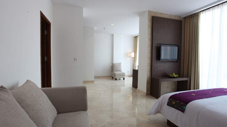 Das Hotel Park Regis Kuta bietet insgesamt 175 Nichtraucherzimmer, die sich sowohl im Haupthaus als auch in den Nebengebäuden befinden. Die Zimmer sind modern eingerichtet und verfügen über Annehmlichkeiten wie Klimaanlage, Balkon oder Terrasse, Minibar und Schreibtisch. In der Kochnische finden Sie einen Kühlschrank, eine Mikrowelle und eine Tee-/Kaffeemaschine. Die Badezimmer sind mit Dusche, Badewanne und Haartrockner ausgestattet.