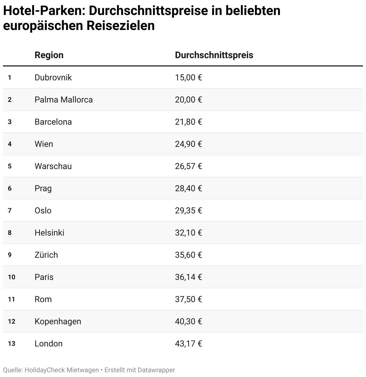 Etwas moderater, aber immer noch deutlich über deutschem Niveau, zeigen sich Prag (28,40 Euro), Warschau (26,57 Euro) und Wien (24,90 Euro). Am günstigsten unter den untersuchten internationalen Urlaubszielen zeigt sich Palma de Mallorca mit 20,00 Euro pro Tag – die beliebte Balearen-Insel bietet damit vergleichsweise moderate Hotel-Parkpreise. Dennoch wird deutlich: Die Spanne zwischen der teuersten und günstigsten untersuchten Stadt beträgt beachtliche 23,17 Euro pro Tag.