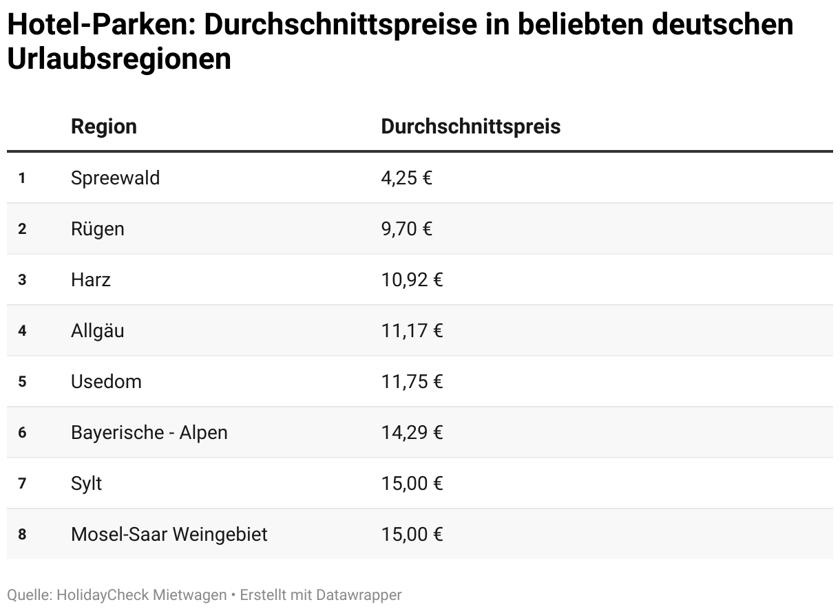 Wo die Landschaft und der Blick weiter wird und Hotels öfter über Außenflächen verfügen, entspannen sich auch die Parkpreise. Das Allgäu punktet mit durchschnittlich 11,17 Euro pro Tag – ideal für eine Region, in der die Anreise mit dem Auto zum Urlaubserlebnis gehört. Der Harz zeigt sich mit 10,92 Euro ebenfalls moderat und budgetfreundlich.
