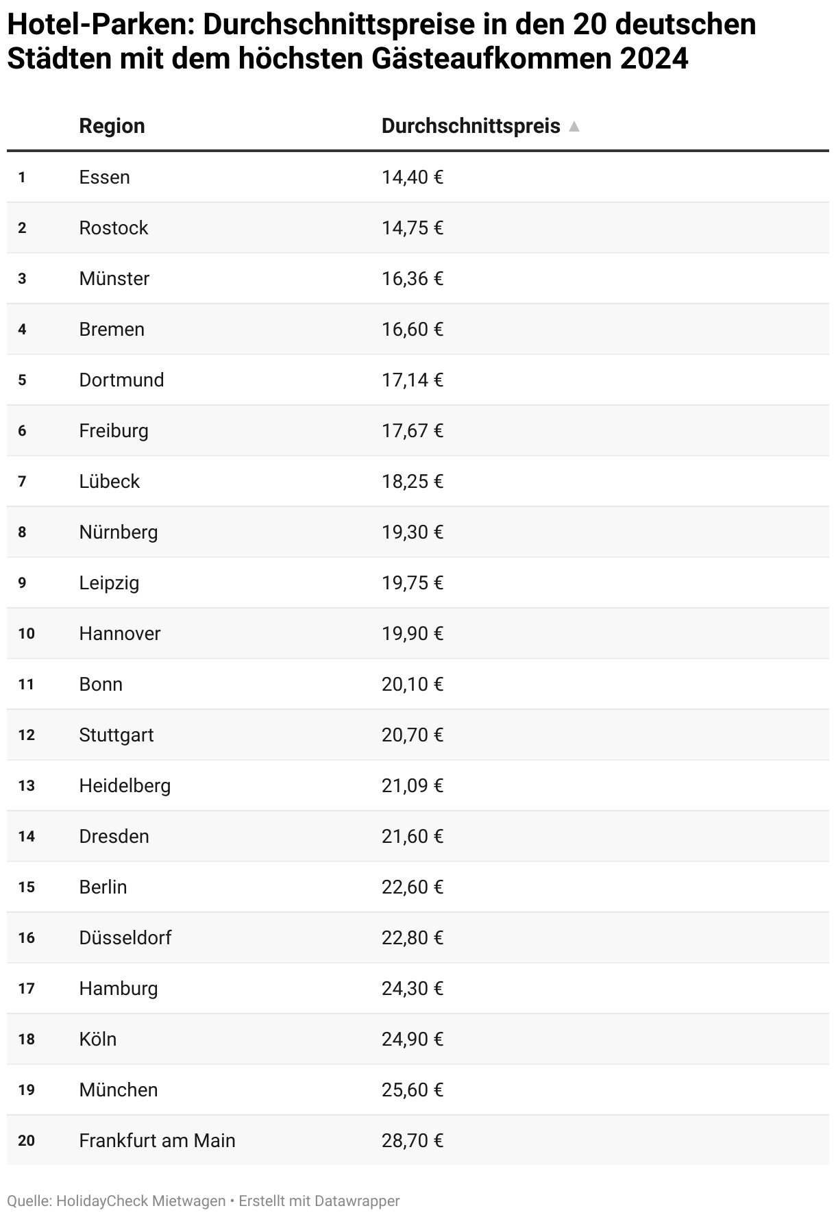Für die Analyse wurden die Parkkosten für einen Tag mit 24 Stunden in 20 deutschen Städten mit den meisten Gästeankünften im Jahr 2024, beliebten deutschen Urlaubsregionen und europäischen Metropolen untersucht. Die Hotelsuche wurde auf der Webseite von HolidayCheck durchgeführt, wobei die Ergebnisse nach den folgenden Kriterien gefiltert wurden: nur Hotels ab 4 Sternen und mit Parkplatz. Die Sortierung der Ergebnisse erfolgte nach den "Bestsellern" von HolidayCheck. In die Auswertung wurden alle Orte einbezogen, bei denen für mindestens vier Hotels Preisangaben für das Parken verfügbar waren und wo das Parken etwas kostet. Kostenlose Parkoptionen wurden nicht ausgewertet. Die Preisangaben beziehen sich auf einen Tag mit 24 Stunden und die jeweils günstigste Parkoption in den Hotels. Wenn möglich, wurden bis zu 10 Preisangaben pro Ort oder Stadt berücksichtigt. Für die Orte St. Peter Ording, Südtirol und die Sächsische Schweiz konnten aufgrund von der geringen Anzahl an online einsehbaren Parkplatzkosten nur 2 Hotels berücksichtigt werden, weshalb diese nicht im Vergleich aufgeführt sind. Die Angaben zu den Parkplatzpreisen stammen entweder von HolidayCheck oder von den offiziellen Webseiten der Hotels. Bei den angegebenen Preisen für jede Destination handelt es sich um den Durchschnittswert aus mehreren Parkpreisen. Preise für Städte mit einer Fremdwährung wurden zum tagesaktuellen Wechselkurs zum Zeitpunkt der Recherche umgerechnet und gerundet. Trotz großer Sorgfalt übernimmt HolidayCheck Mietwagen keine Garantie oder Gewährleistung für die hier dargestellten Informationen. Änderungen vorbehalten.